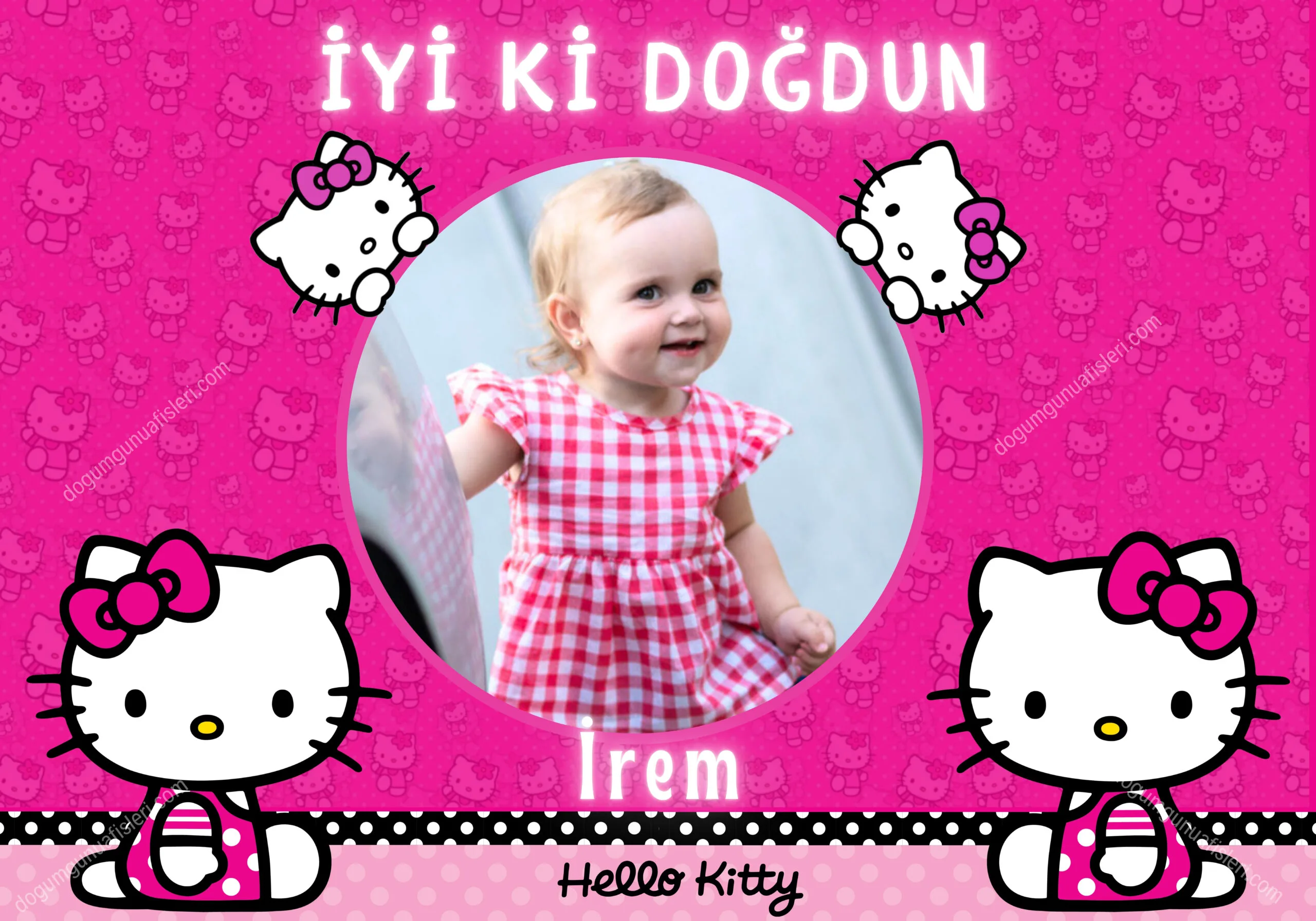 Hello Kitty Doğum Günü Afişi, doğum günü partileriniz için konseptinizi tamamlayacak en güzel süsleme. Kişiye özel olarak hazırlanan doğum günü afişiniz sipariş verdikten sonraki gün kargoda.