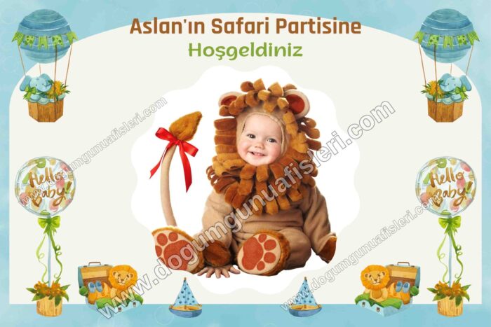 Safari Konsepti seven çocuklar için özel tasarladığımız afişimiz kaliteli vinil üzerine basılmaktadır. Safari Doğum Günü Afişi doğum günü masasının arkasına, duvara asılabilir. Güzel bir görüntü için çevresine zincir balon hazırlayabilirsiniz.