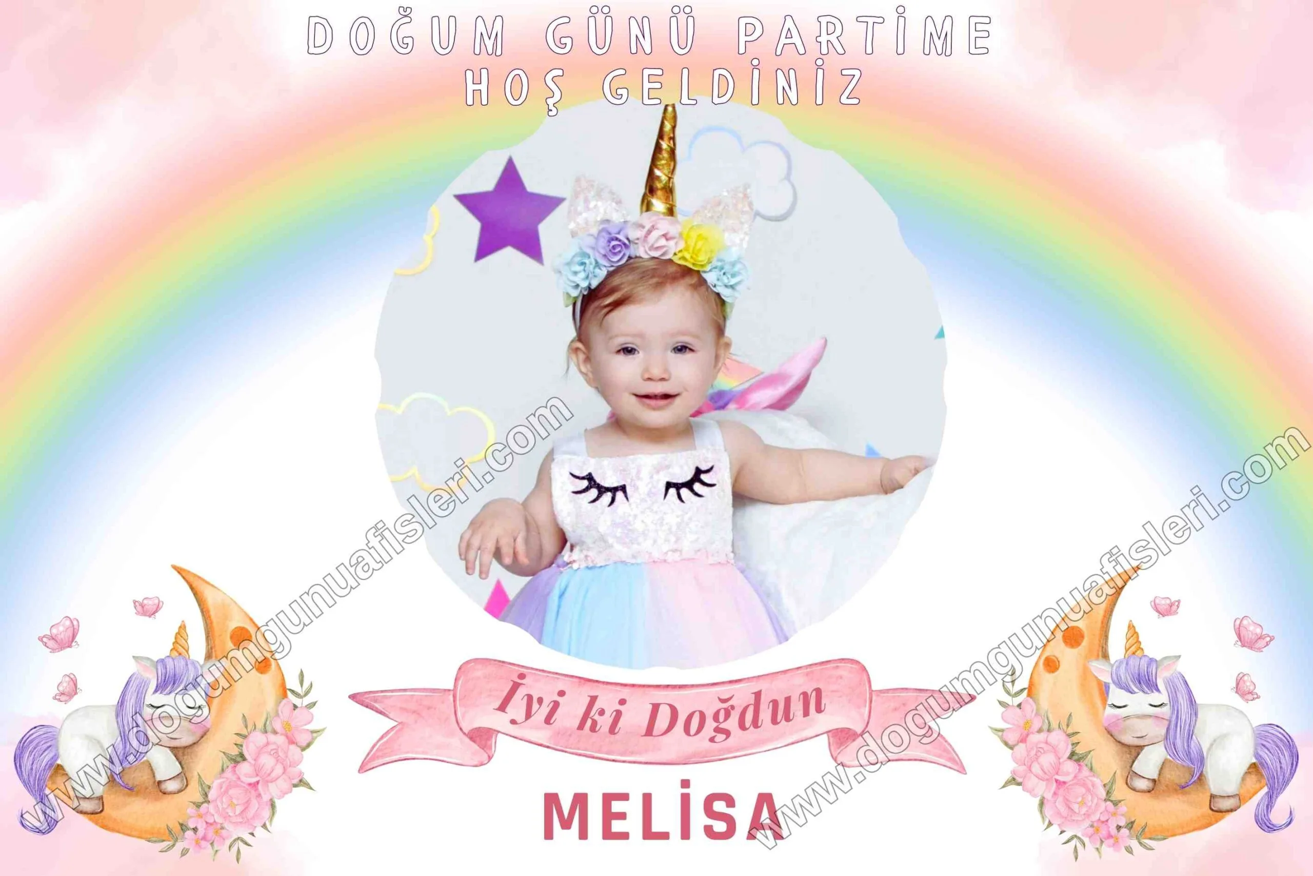 Unicorn Doğum Günü Afişi, doğum günü partileriniz için konseptinizi tamamlayacak en güzel süsleme. Kişiye özel olarak hazırlanan doğum günü afişiniz sipariş verdikten sonraki gün kargoda.